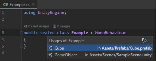 概要 MonoBehaviour を継承したクラスを右クリックして「Find Unity Usages」を押すと どのシーンやプレハブで使用されているかを Rider 上で確認できます Unity 上にも結果が表示されるため、Unity からも確認できます クラス名の上に表示されている「XXXX …