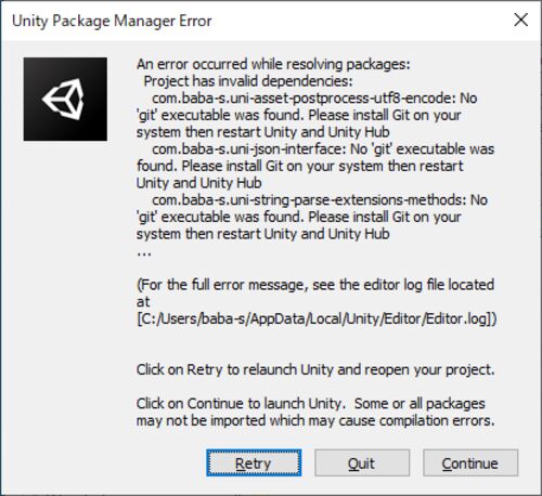 はじめに Unity プロジェクトを開く時に Unity Package Manager Error An error occurred while resolving packages: Project has invalid dependencies: xxxx: No 'git' executable was found. Please install Git on your system and restart Unity and Un…