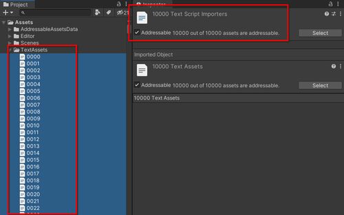 検証環境 Windows 10 Unity 2020.3.13f1 Addressables 1.19.11 検証方法 10,000 個の Text Asset(.txt)を用意して すべての Text Asset にアドレスを割り振って Default Local Group に追加して Default Local Group の Bundle Mode を 「Pack Together(…