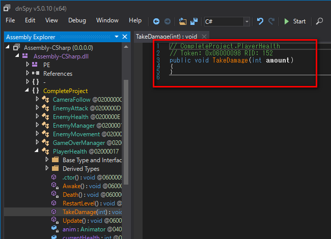 dnSpy ウィンドウに戻ると TakeDamage 関数が空になっていることがわかります
