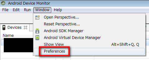 Android Device Monitor メニューの「Window > Preferences」を選択して
