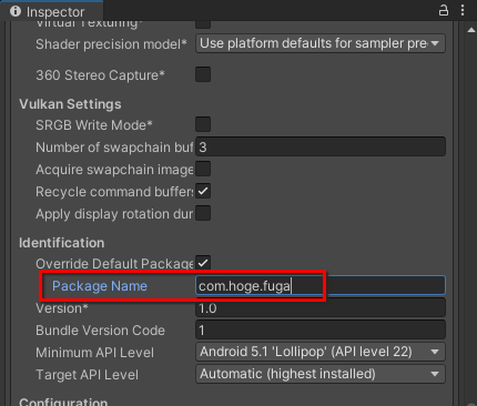 ダイアログを閉じた後に Inspector に表示される PlayerSettings で