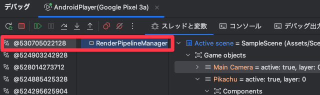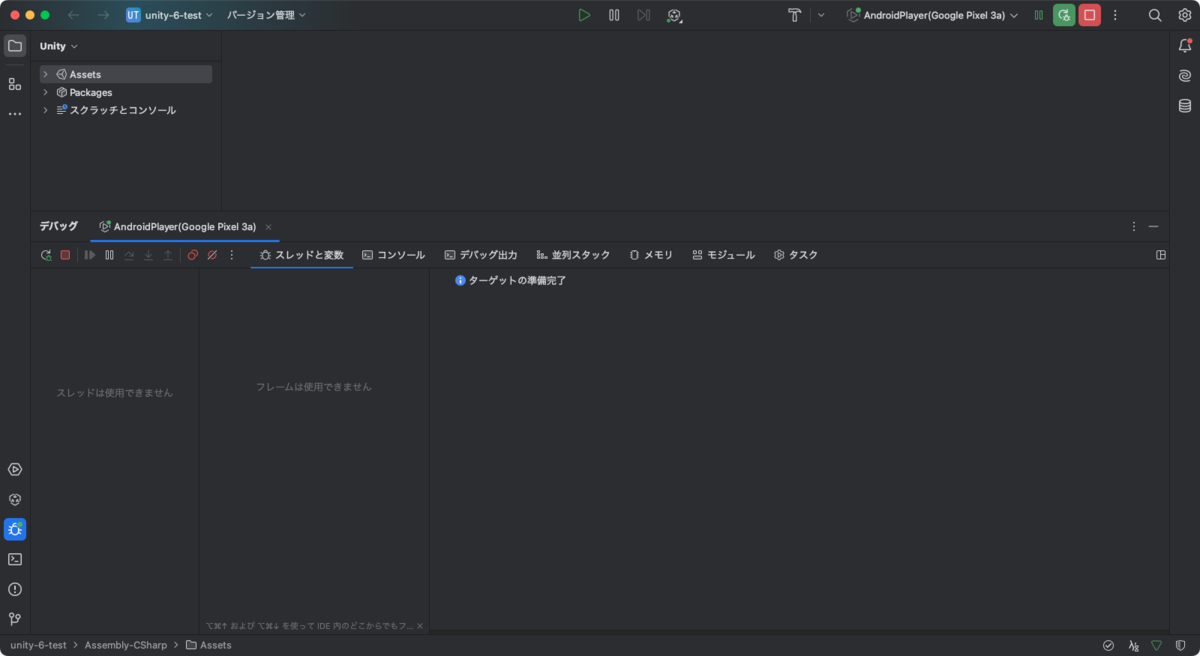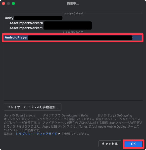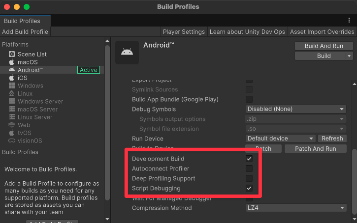 「Development Build」と「Script Debugging」をオンにして「Build And Run」した後に
