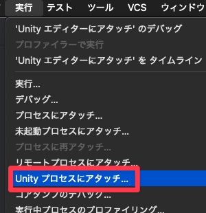 Rider の「実行 > Unity プロセスにアタッチ」を選択して