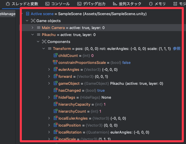 現在のシーンの Hierarchy の情報を Rider で確認できる。